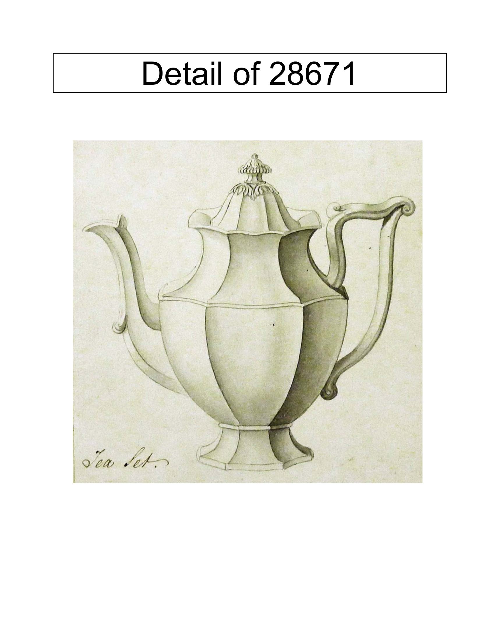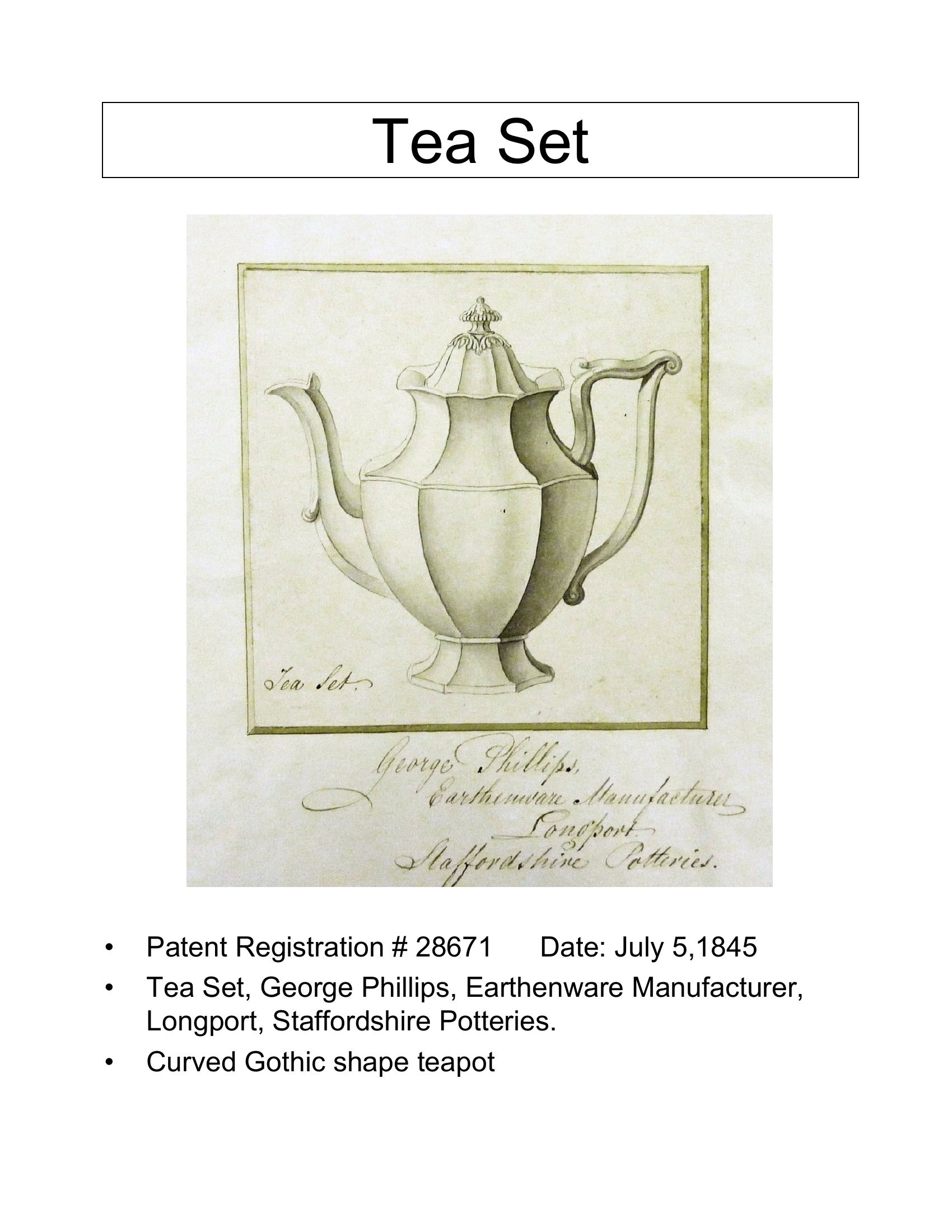 View PDF Kew Registration # 28671 Registrar (Potter, Modeler or Agent) George Phillips Date Registered July 05, 1845 Shape Gothic Items Teapot or Coffee Pot Base and Lid Circa Decade 1840s
